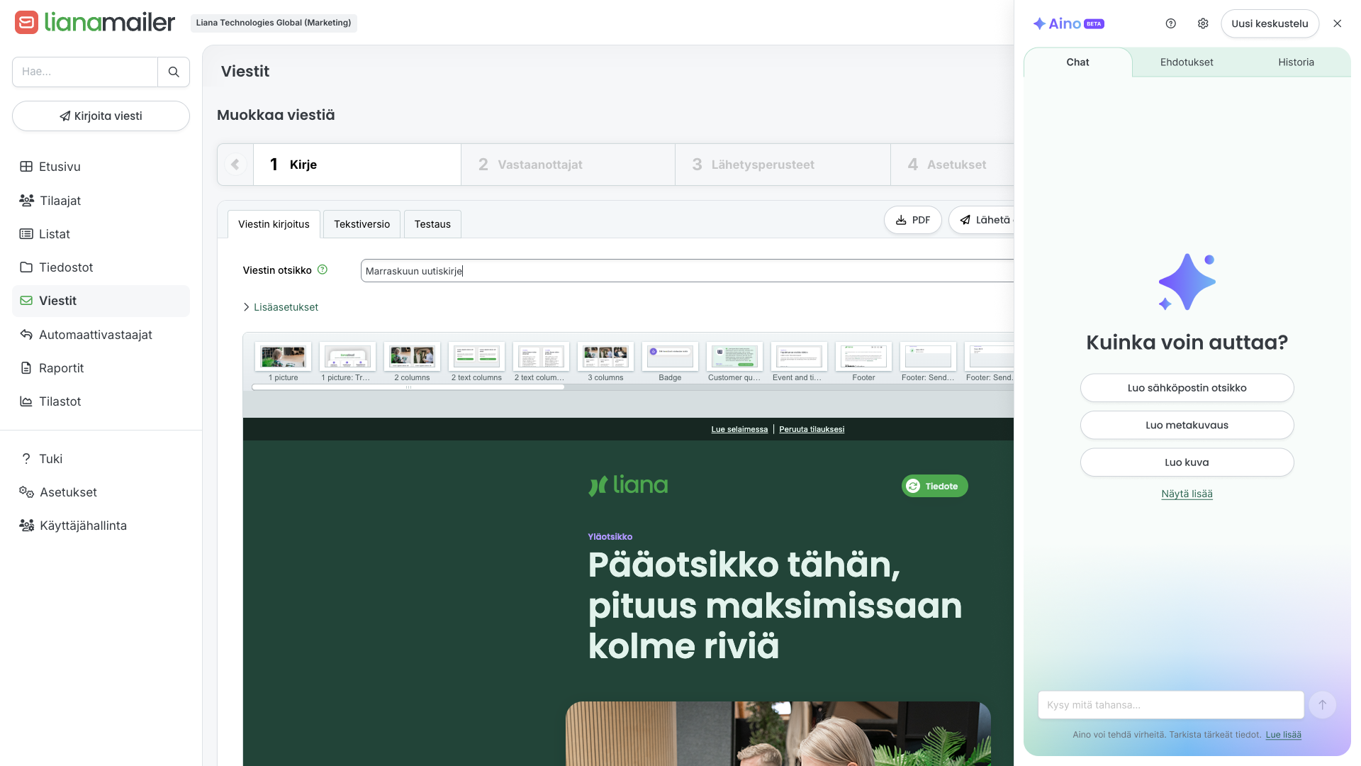 - Mitä Aino tekee? Auttaa sinua luomaan esimerkiksi uutiskirjeiden ja lehdistötiedotteiden sisällöt ja kuvat hetkessä.