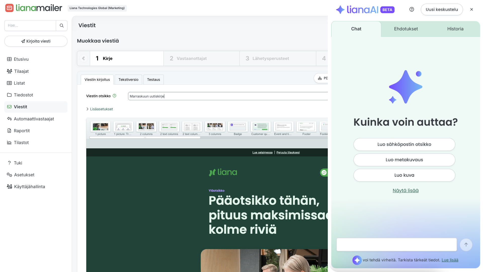 Sinä markkinoinnin ja viestinnän ammattilainen, joka arvostat tehokkuutta, datan turvallisuutta, helppokäyttöisyyttä ja haluat pysyä ajan tasalla uusista teknologioista – Liana AI on uusi tehokas avustajasi!