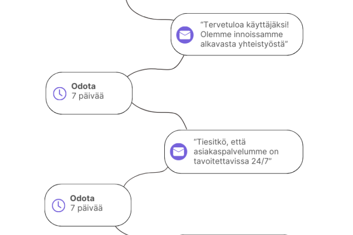Markkinoinnin automaatio on erinomainen väline asiakassuhteen kehittämiseen. Automatisoitujen ja personoitujen onboarding-viestien avulla pidät huolta, että asiakas kuulee sinusta säännöllisesti ja että hän saa parasta mahdollista palvelua. Onboarding-viestien avulla on helppo varmistaa, että kaikki asiakkaasi saavat heidän hankkimiaan tuotteita ja jäsenyyksiä koskevaa tietoa oikeassa kohdassa asiakaspolkua.