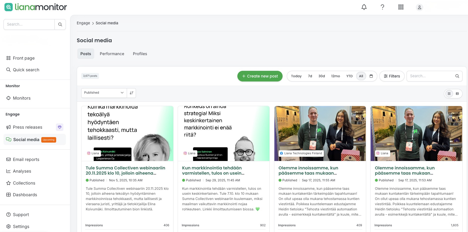 Lianalla sinulla on joustavuus laajentaa niihin ratkaisuihin joita tarvitset. Saat täyden synergian viestintääsi sillä sosiaalisen median hallinta on integroitu LianaMonitoriin ja voit verrata tuloksia suoraan lehdistötiedotteiden ja perinteisen median tuloksiin.