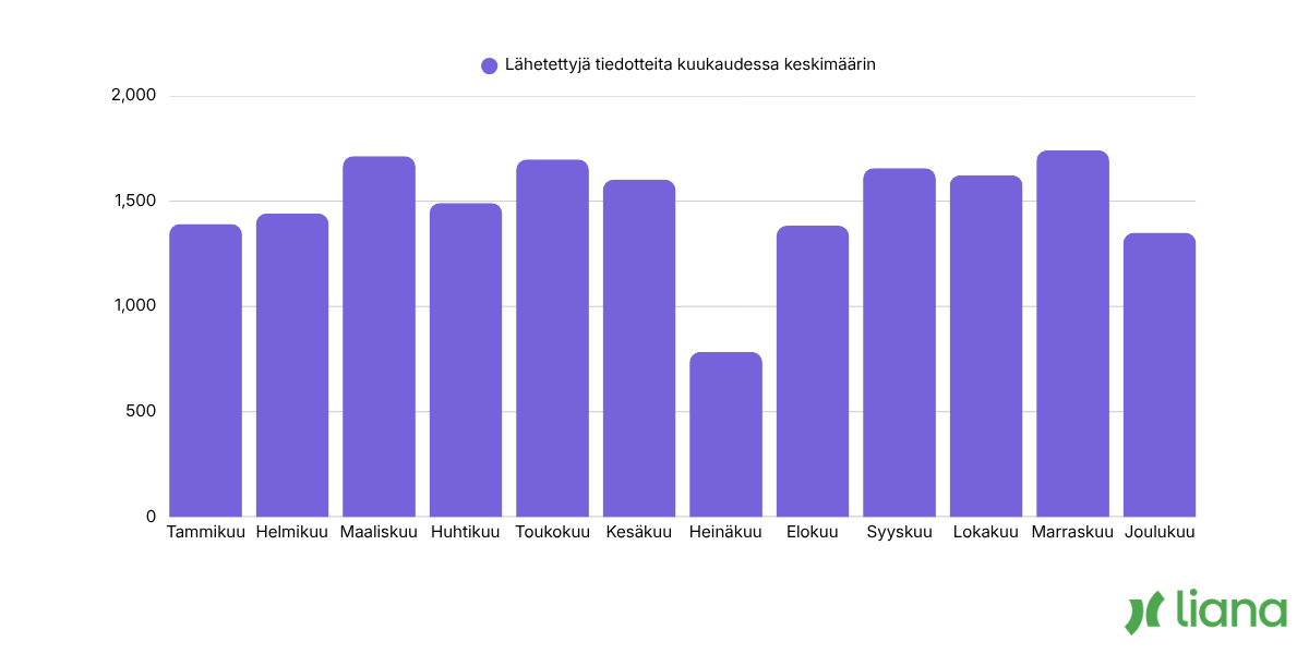 Lianan statistiikkaa tiedotteiden lähetysmääristä kuukausittain