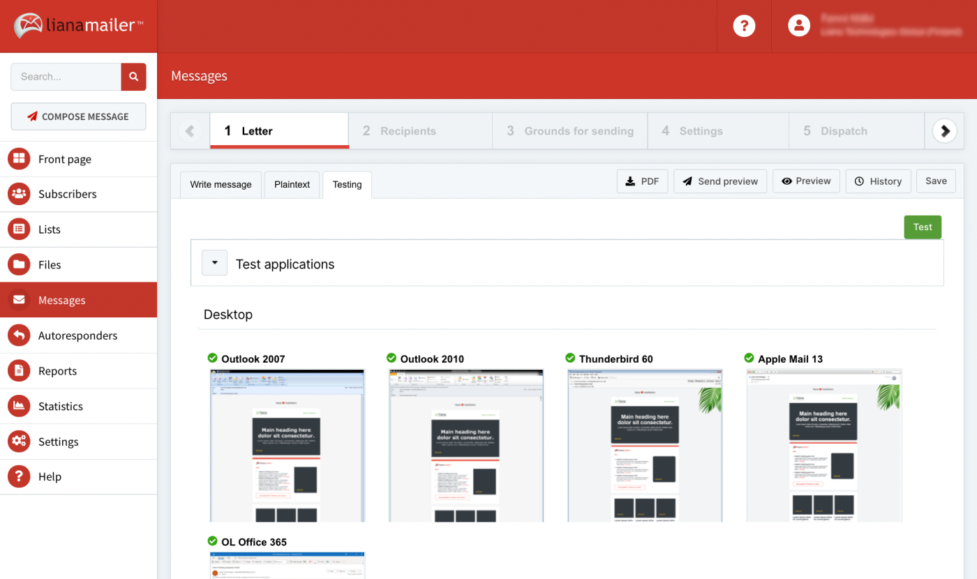 Edistyksellisen ja käyttäjäystävällisen uutiskirjetyökalun avulla voit nopeasti testata uutiskirjeen, jota olet lähettämässä. LianaMailer tarjoaa Litmus-testausta osaksi lähetysprosessia. Yhdellä lähetyksen välilehdistä voit ajaa testin, joka näyttää välittömästi miltä uutiskirjeesi näyttää esimerkiksi iPhone 12 -näytöllä. Toinen ohjelmisto testaukseen on Everest.