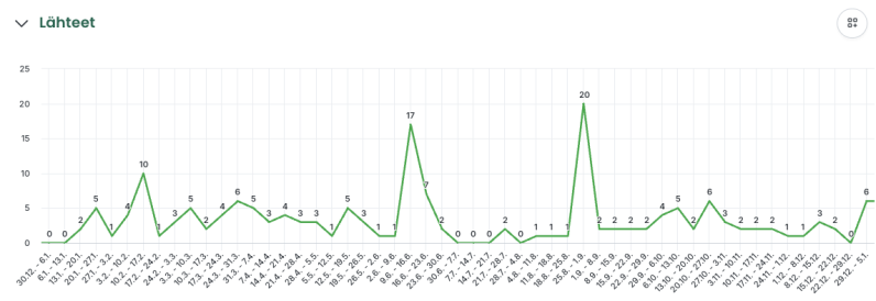 LianaMonitorin analyysinäkymää osumalähteiden lukumäärästä