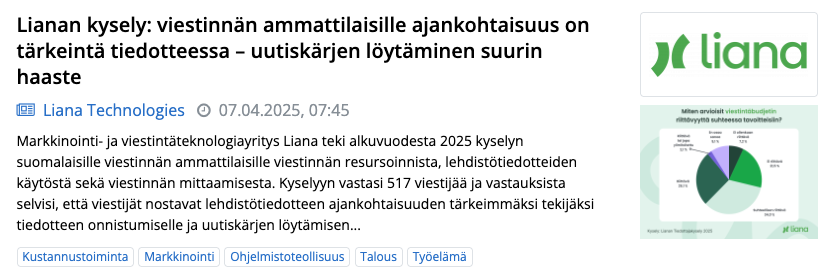 Tiedote voi nousta esiin erityisesti silloin, kun henkilö hakee tietoa yrityksestä, sen tuotteista tai toimialan muutoksista. Kun tiedote julkaistaan esimerkiksi kotimaisissa uutiskanavissa, kuten Yle, Helsingin Sanomat tai Kauppalehti, sen uskottavuus kasvaa merkittävästi. Hakukoneet ja tekoälyavustajat tunnistavat median auktoriteetin. Tämä lisää todennäköisyyttä sille, että tiedotteen sisältöä hyödynnetään AI-vastauksissa ja tekoälypohjaisessa tiedonhaussa.