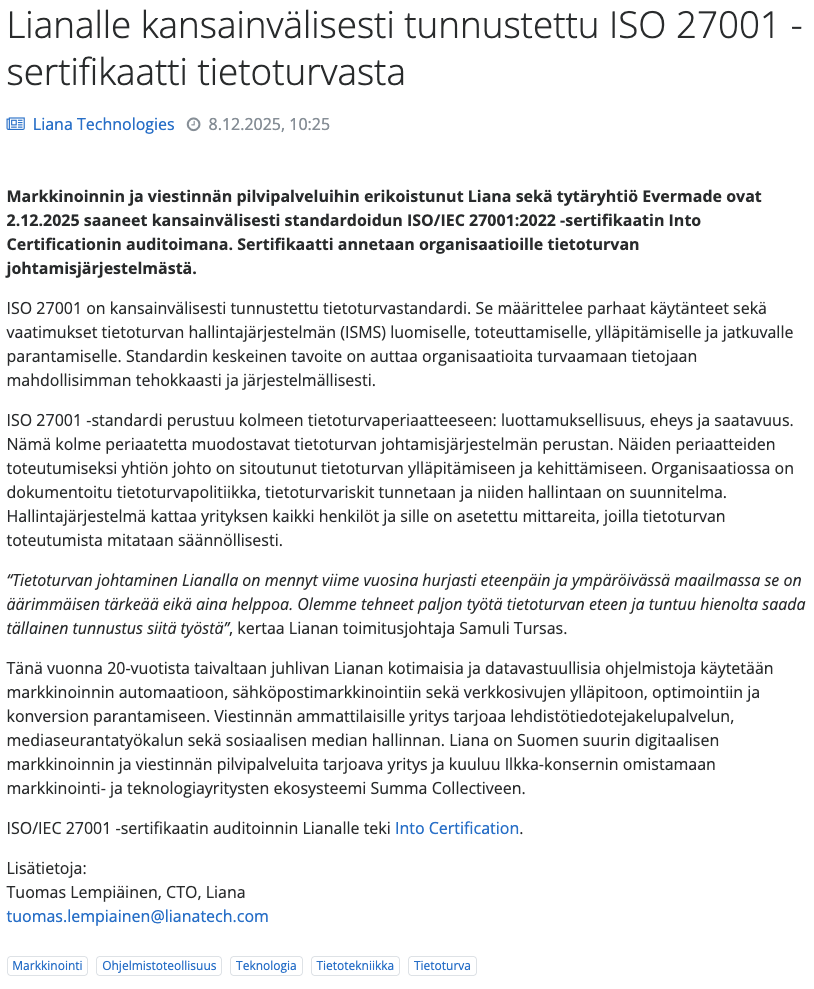 - Tiedote julkaistaan auktoriteettikanavassa